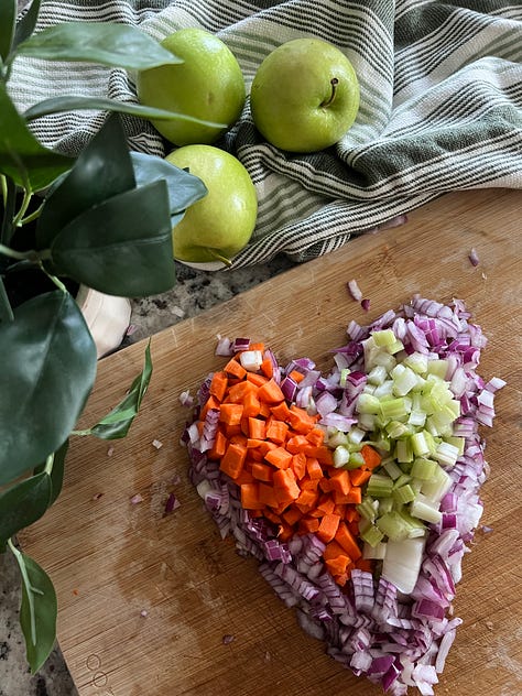 Add diced onion, carrots, celery, and garlic. Cook for 5–7 minutes until softened.