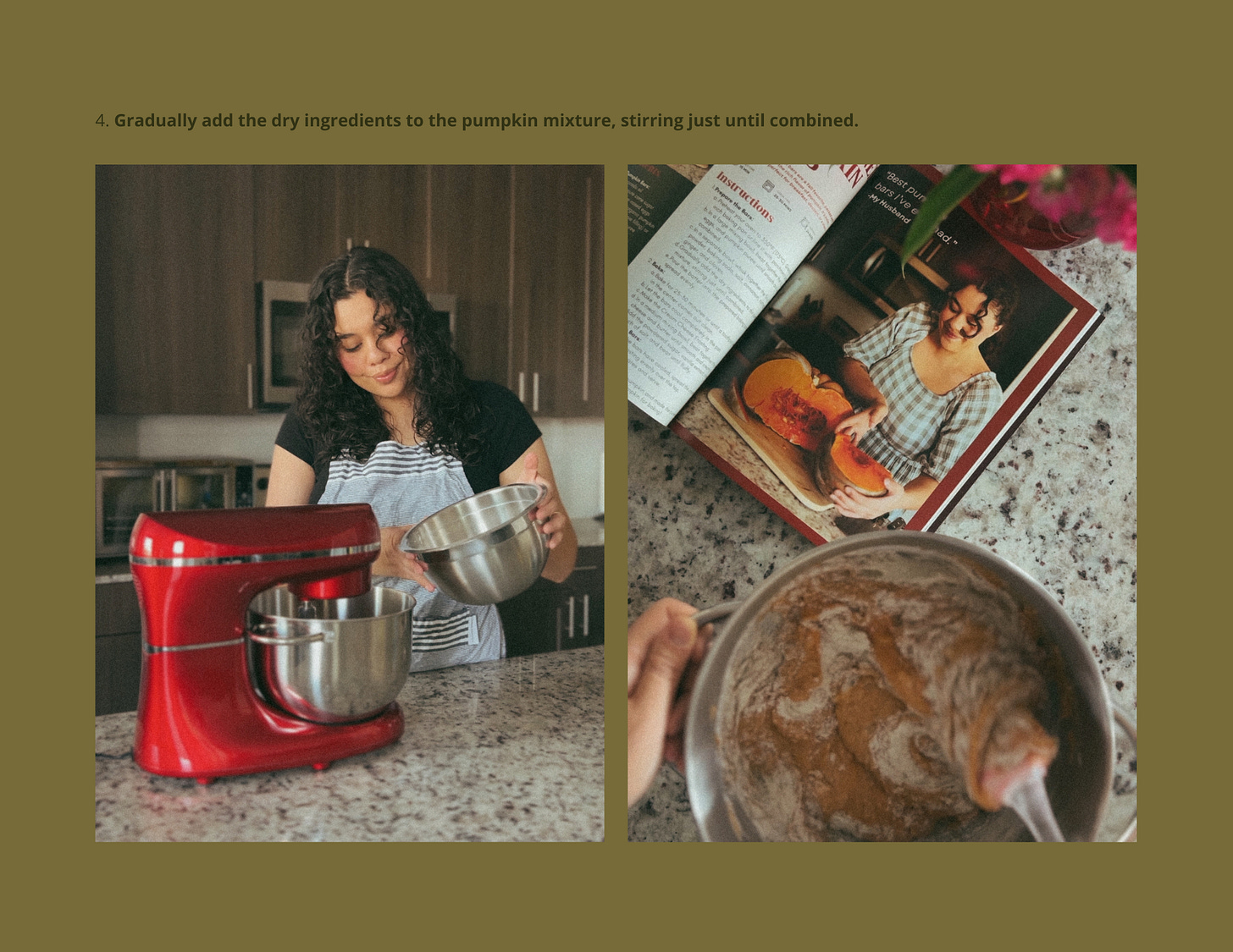 Gradually add the dry ingredients to the pumpkin mixture, stirring just until combined.