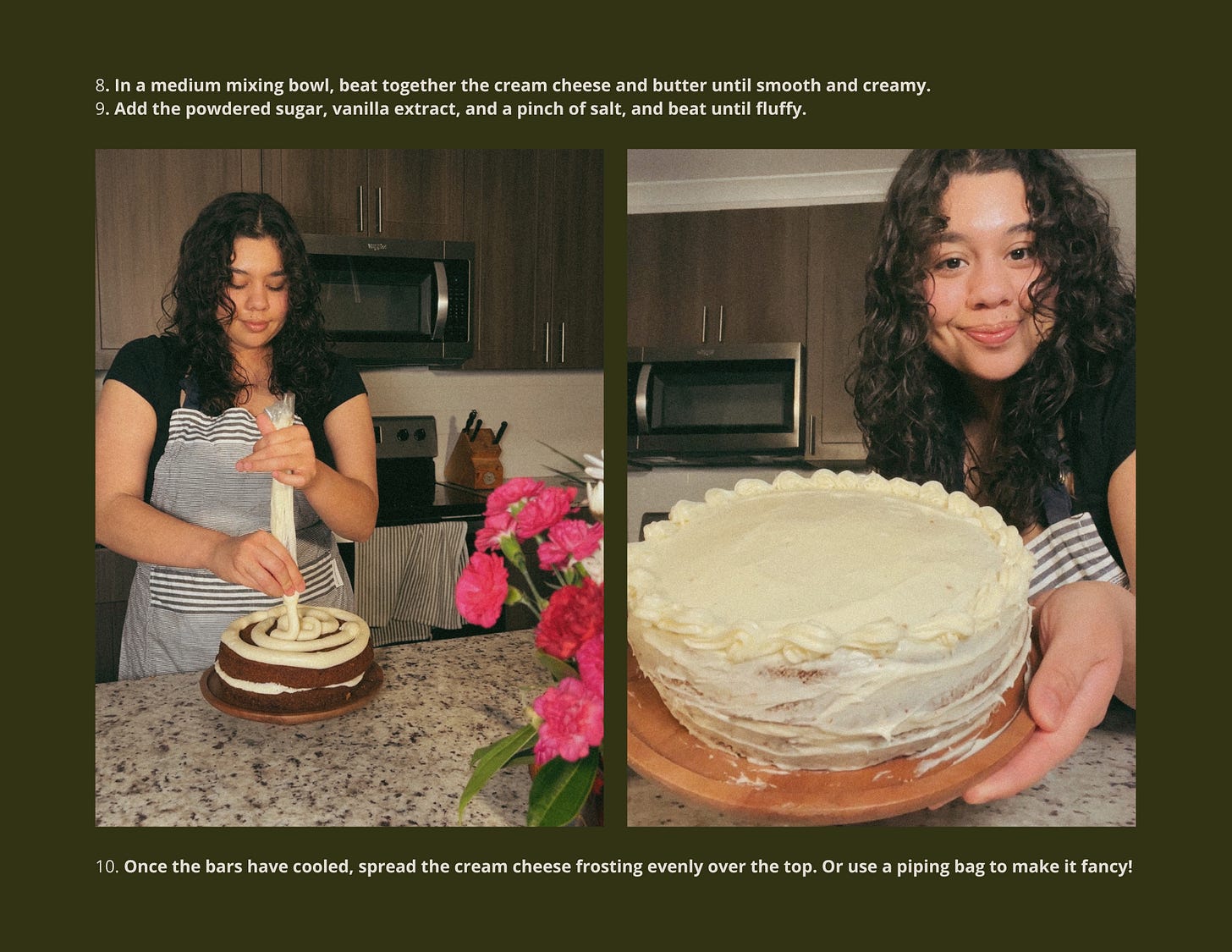 Once the bars have cooled, spread the cream cheese frosting evenly over the top.